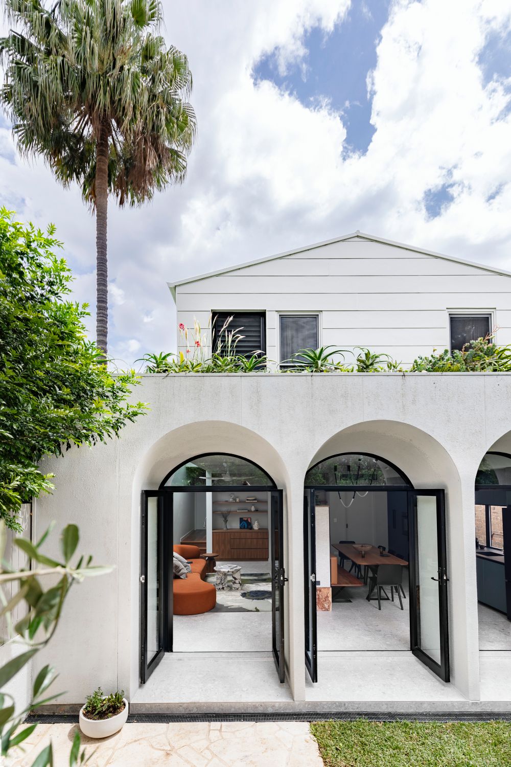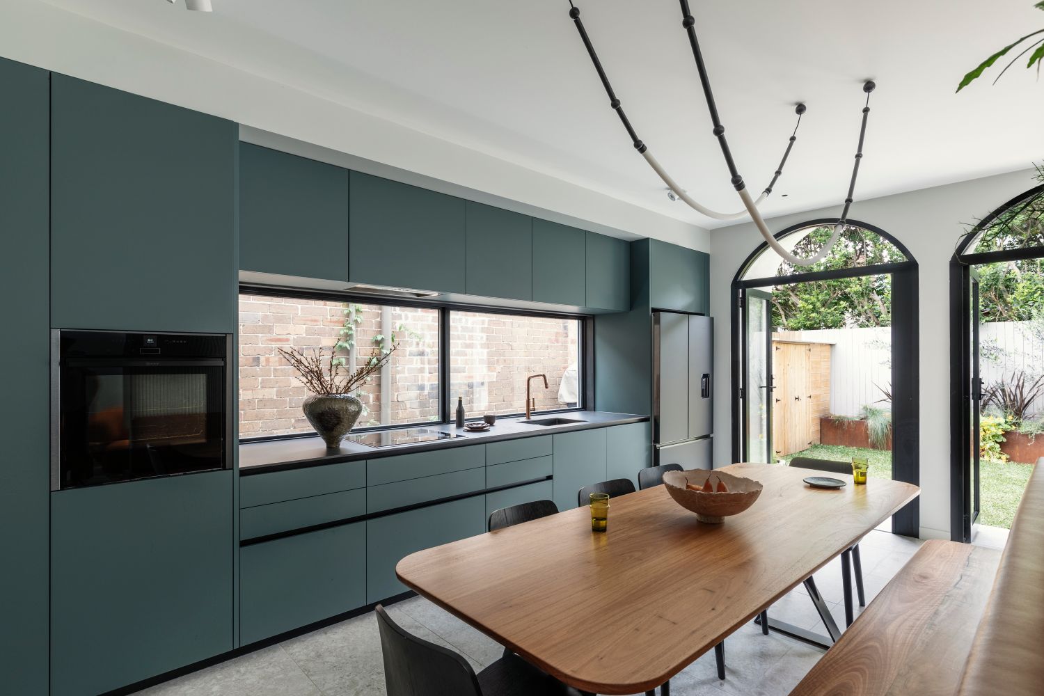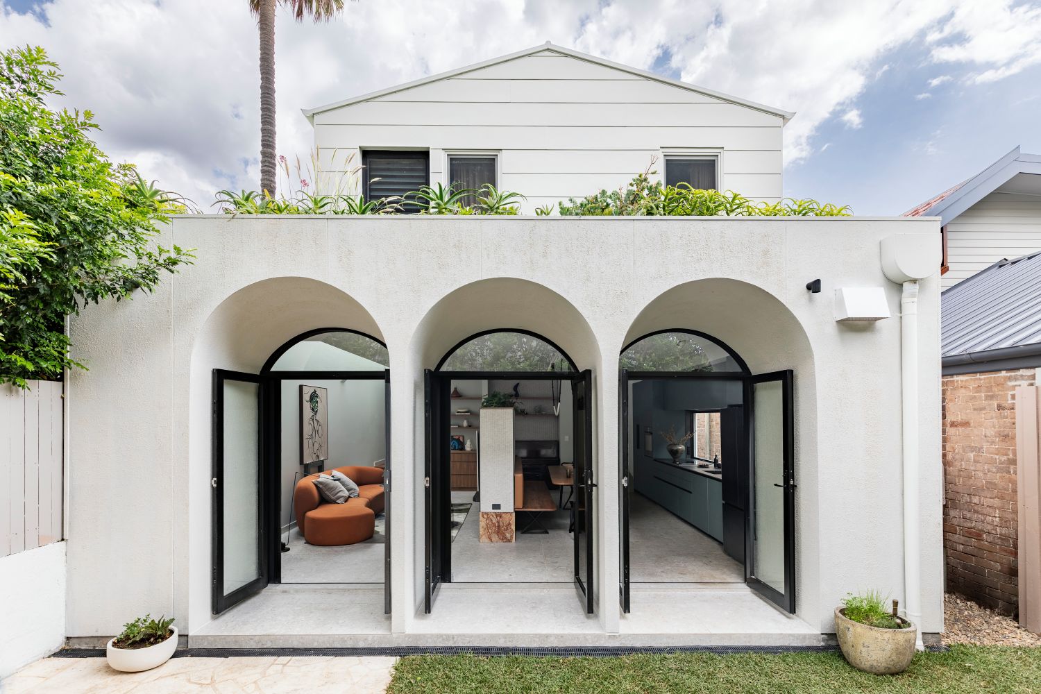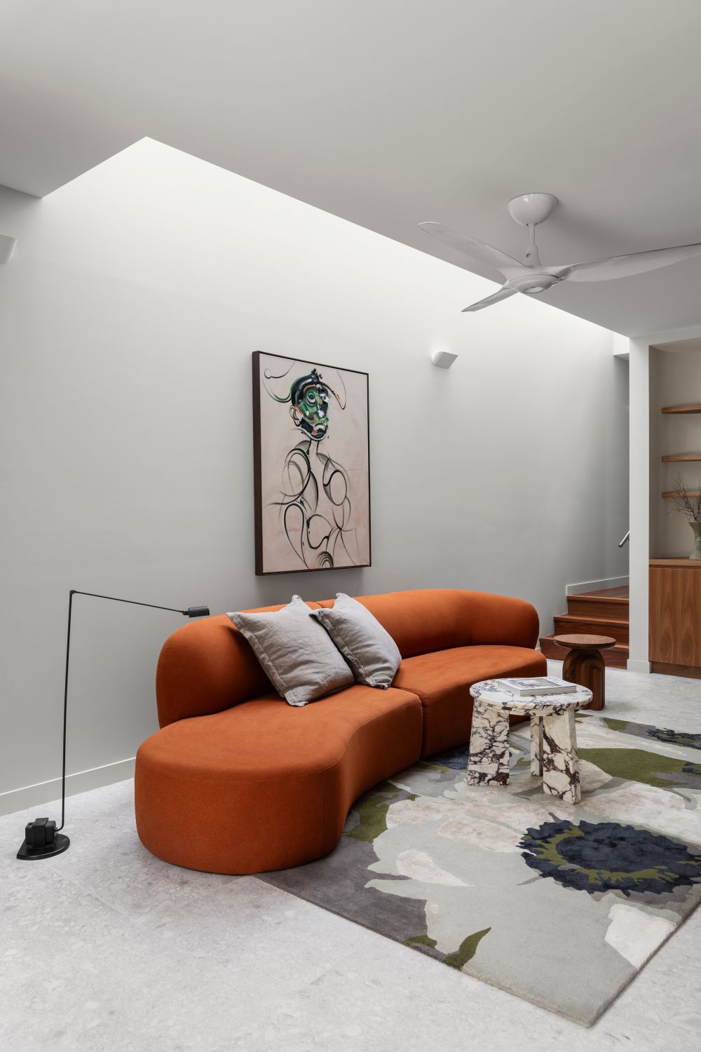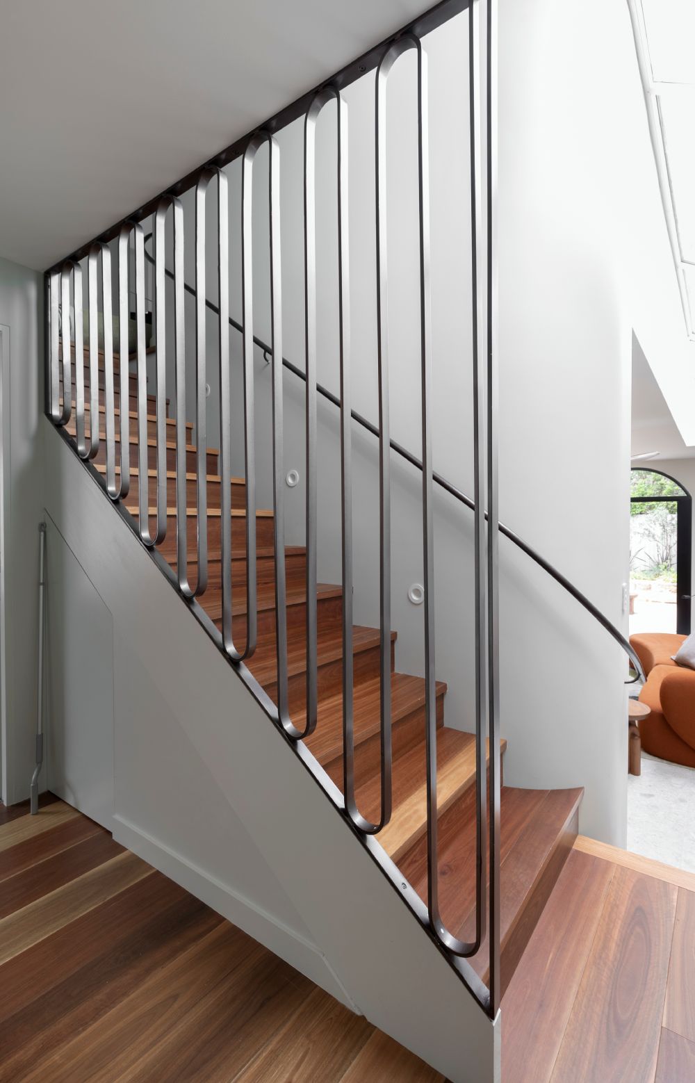 Comprehensive renovation with two-story extension featuring a distinctive green roof with conical arches. This technically challenging build required innovative solutions to achieve the clean architectural finish that defines our work. Features include two-story curved walls, custom steel work throughout the stairwell including a solid arced wall rail, and a full height diminishing sinuous balustrade.