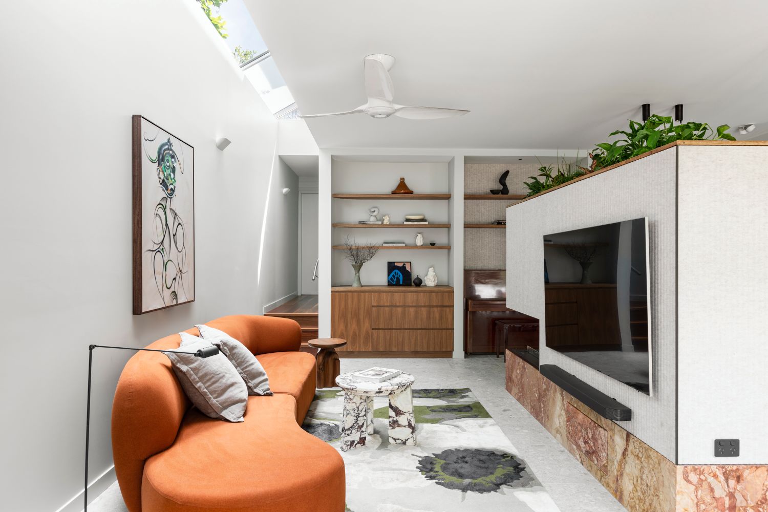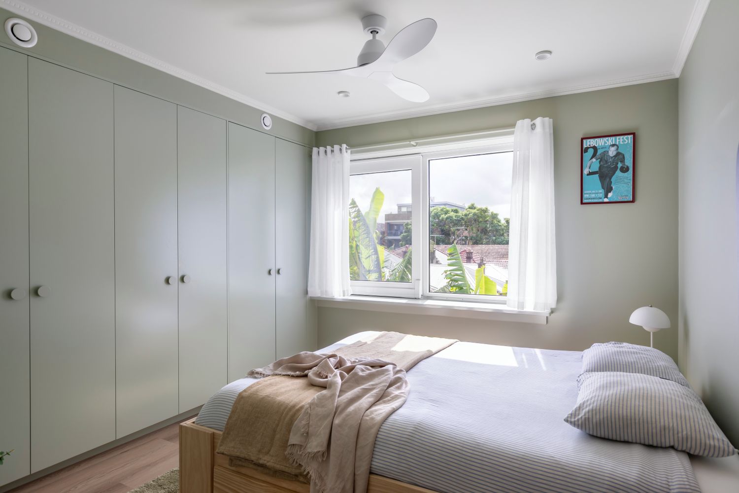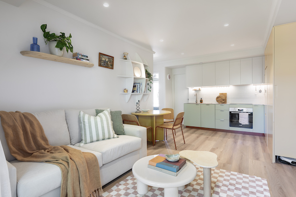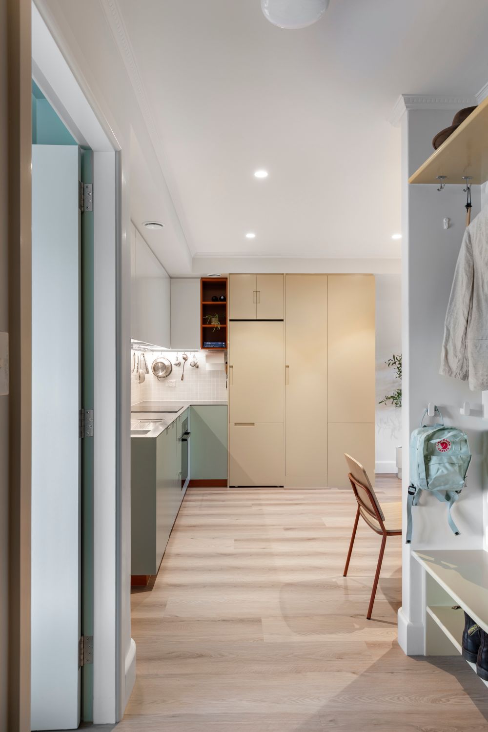 Unit renovation completed in line with Passive House EnerPHit standards. This project achieved an exceptional airtightness rating of 0.70 air changes per hour, significantly surpassing the typical requirement of 1.0 for renovations. The design preserves the original character with deep window reveals, detailed cornices and tessellated bathroom tiles.